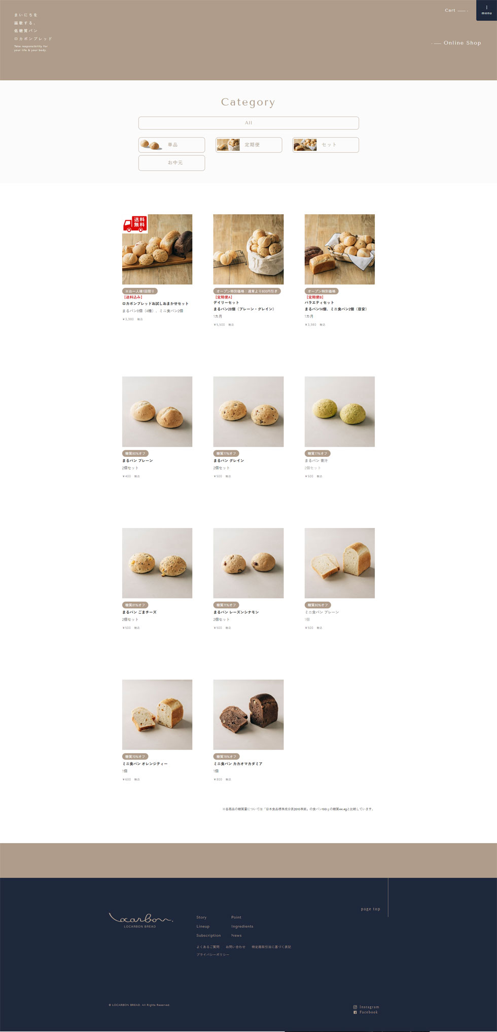 We produced a corporate website and an e-commerce site for LOCARBON BREAD, a company that sells a popular sugar-free bread with up to 81% less sugar. The main target audience is women in their 20s to 40s, so we used a mature and relaxed design with slow and calm animations to create a consistent design for the two sites.