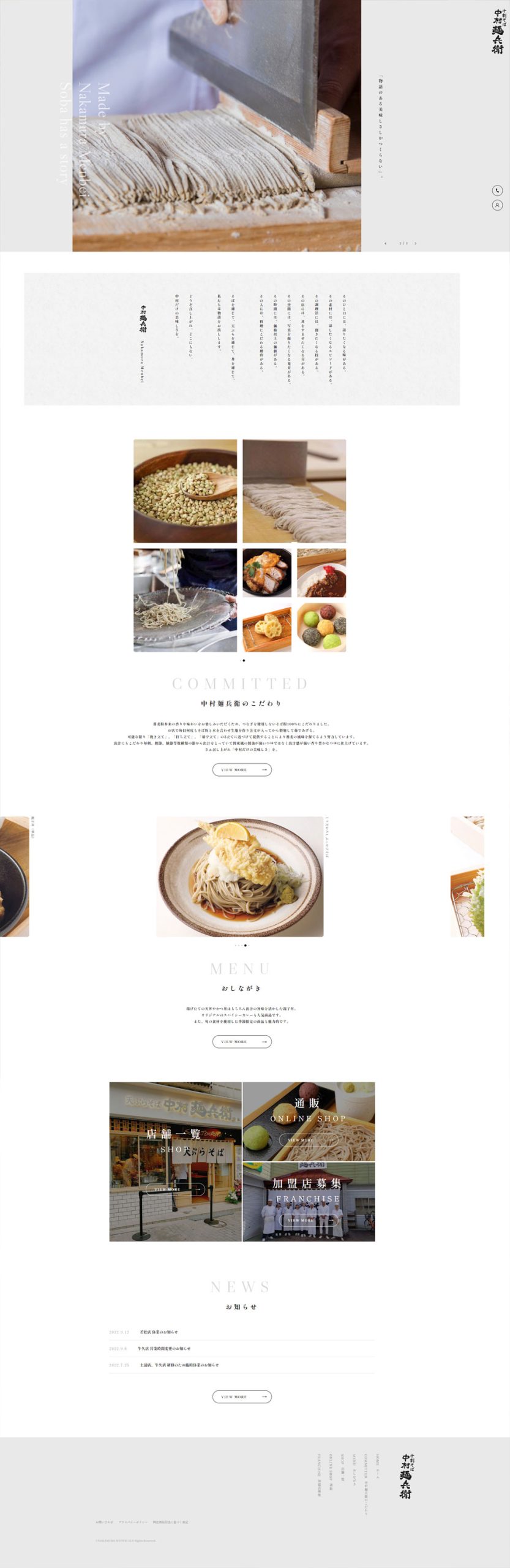 We created a corporate site and an EC site for Nakamura Menbei, a buckwheat noodle restaurant that uses 100% buckwheat flour without any additives, so that customers can enjoy the original aroma and flavor of the buckwheat flour. The corporate site uses large photos and videos to convey the atmosphere of the restaurant and the deliciousness of the food, and the EC site uses few colors and a simple structure to showcase the products.