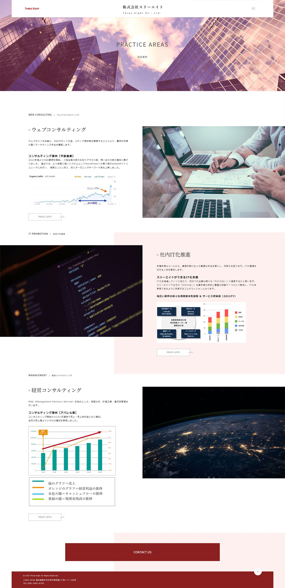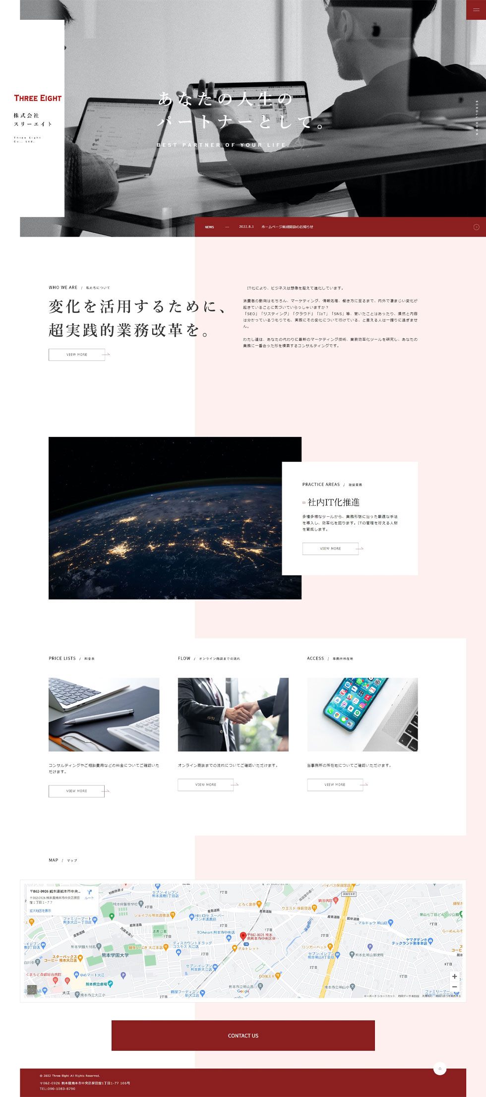 We created a corporate website for 3Eight Inc., a consulting firm that researches the latest marketing technologies and business efficiency tools to find the best fit for their business. We improved and strengthened their recognition by branding the site based on their continuous pursuit of the best solutions for their clients and their extensive track record. We also improved the site's circulation by reviewing the site's navigation. The site was revamped to be responsive and easy to access on mobile devices.